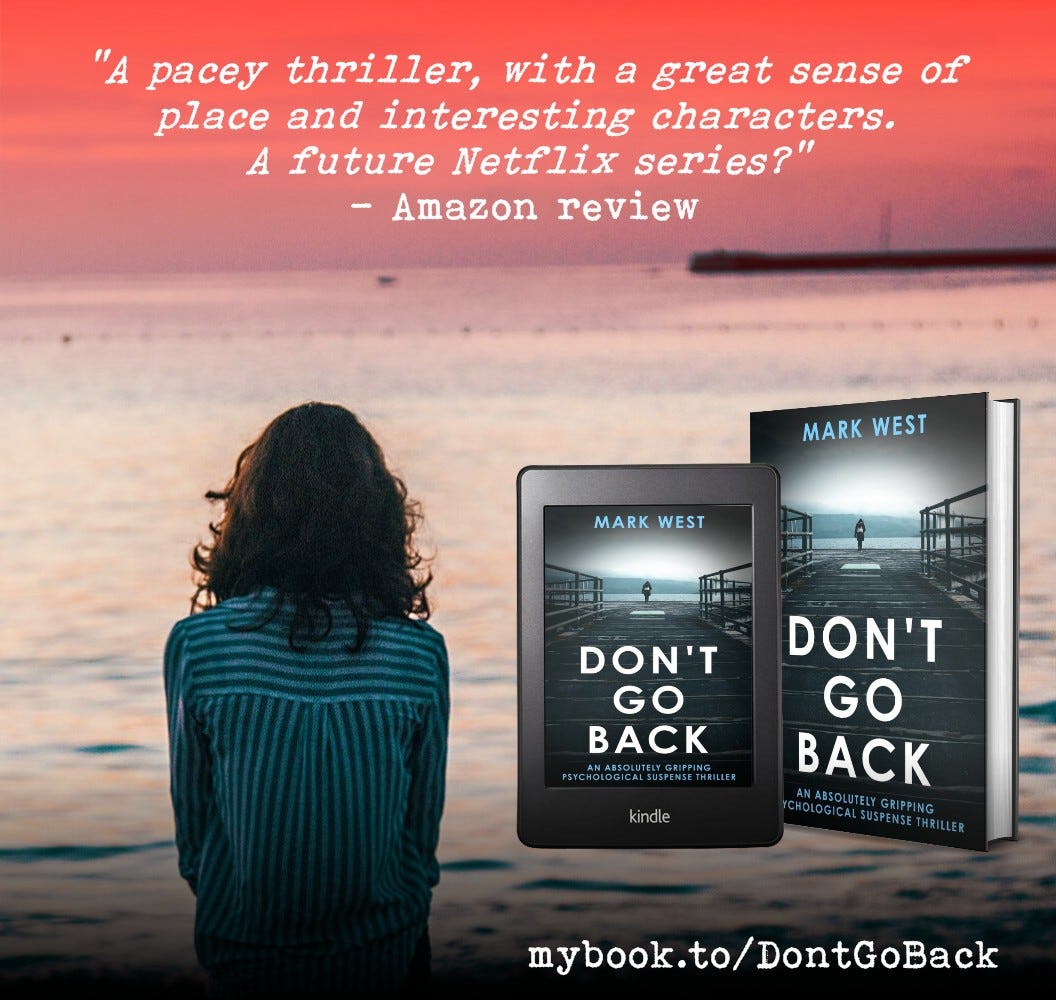 The key thing DON’T GO BACK gave me was the chance to keep going and publish a further six novels with The Book Folks (who were absorbed into Joffe Books last year). It also gave me some confidence in my own ability (most writers will tell you this is something they sorely lack), as well as a sense of how to pace a thriller and build in cliffhangers and, best of all, it gave me back a real joy in the art of writing.